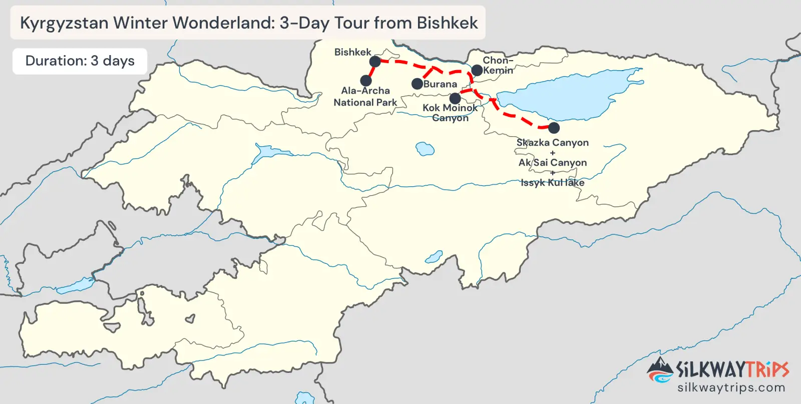 A 3-day winter tour from Bishkek combining Kyrgyz nature, culture, and mountain scenery. Visit Ala Archa National Park, the ancient Burana Tower, and peaceful Chon Kemin valley. Ride horses through snowy fields, explore the red canyons of Kok Moinok and Skazka, and enjoy views over frozen Issyk Kul Lake. Stay in cozy guesthouses or yurts and experience genuine Kyrgyz warmth.